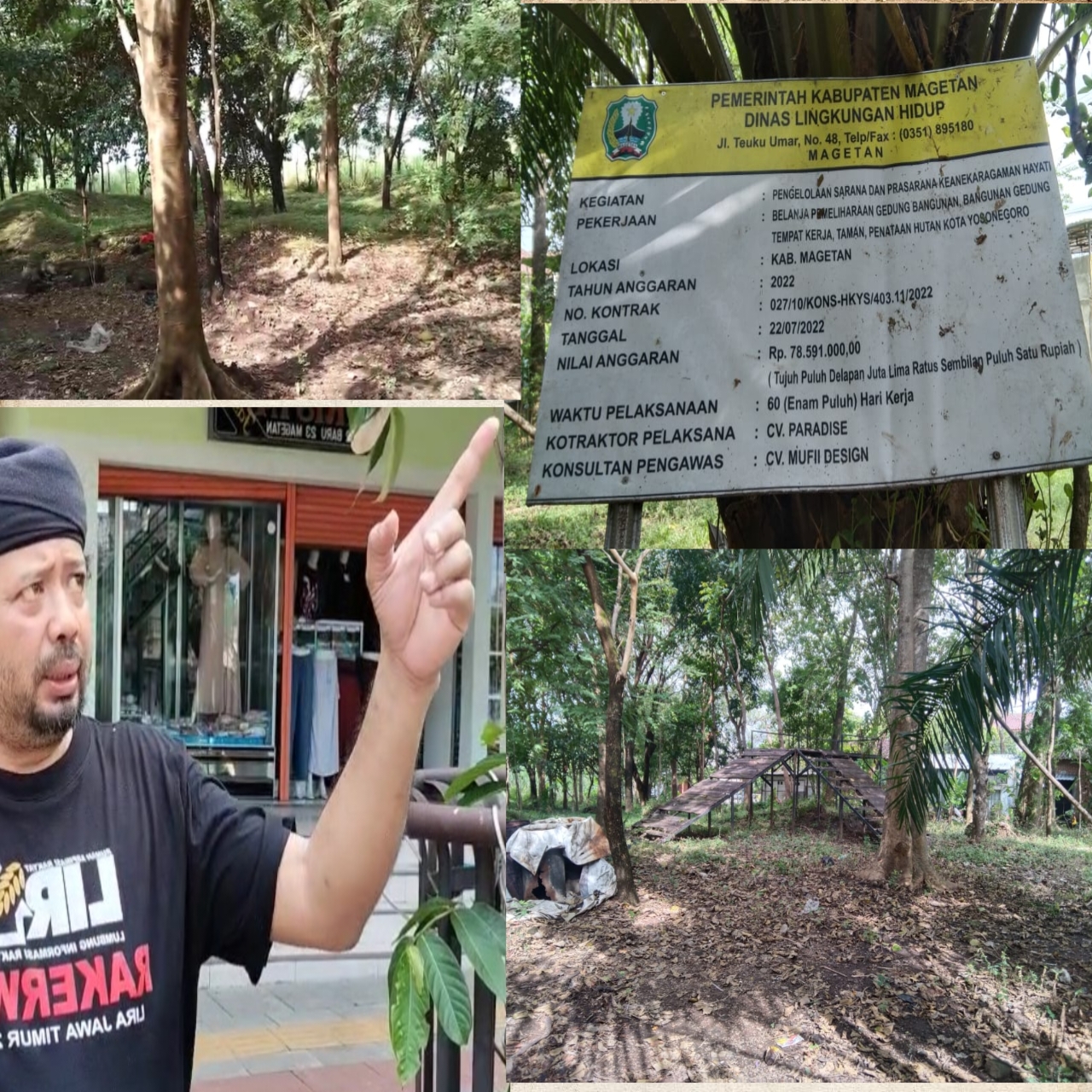 Papan nama bertuliskan pengelolaan sarana dan prasarana keanekaragaman hayati dengan pekerjaan belanja pemeliharaan bangunan gedung , bangunan gedung tempat kerja, taman , penataan hutan kota Yosonegoro tahun 2022 dengan nilai 78.591.000 juta di tiga tahun berjalan terkesan dibiarkan tanpa ada perhatian dari pemerintah kabupaten Magetan.